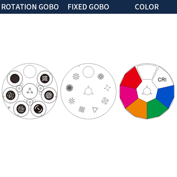 • Rotation gobo: 6 gobos+white,changeable;