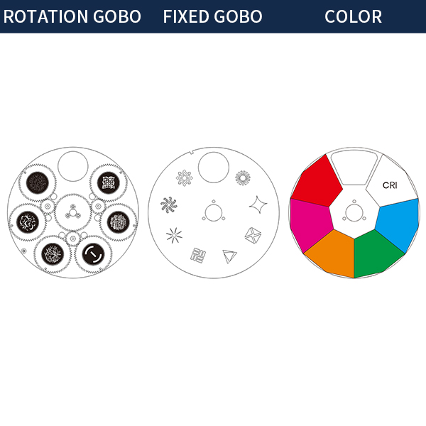 Fixed gobo wheel: 5 fix colors+white+CRI+CMY.CTO:2000-7400K;