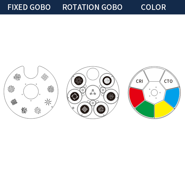 • Color wheel: 6 fixed color chips + white light, CMY infinite color mixing, CTO color temperature, 3200-6500K;